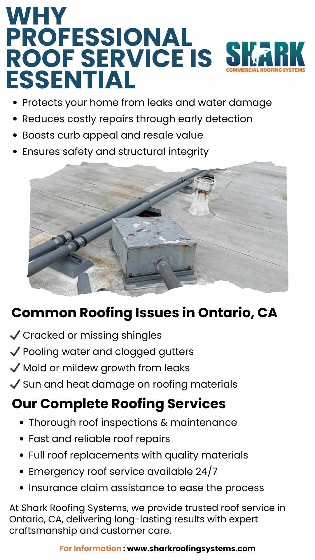 Shark Roofing Systems provides trusted roof service Ontario CA, including leak repairs, shingle replacement, and emergency roofing. We help building owners maintain safe, efficient, and long-lasting roofs with professional care.