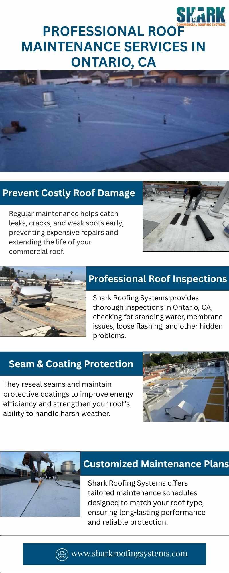 Protect your business property with expert commercial roofing services in Ontario CA from Shark Roofing Systems. Ignoring roof maintenance can lead to costly repairs and structural damage. Our team provides timely inspections, repairs, and coating solutions to extend your roof’s life and safeguard your investment.
