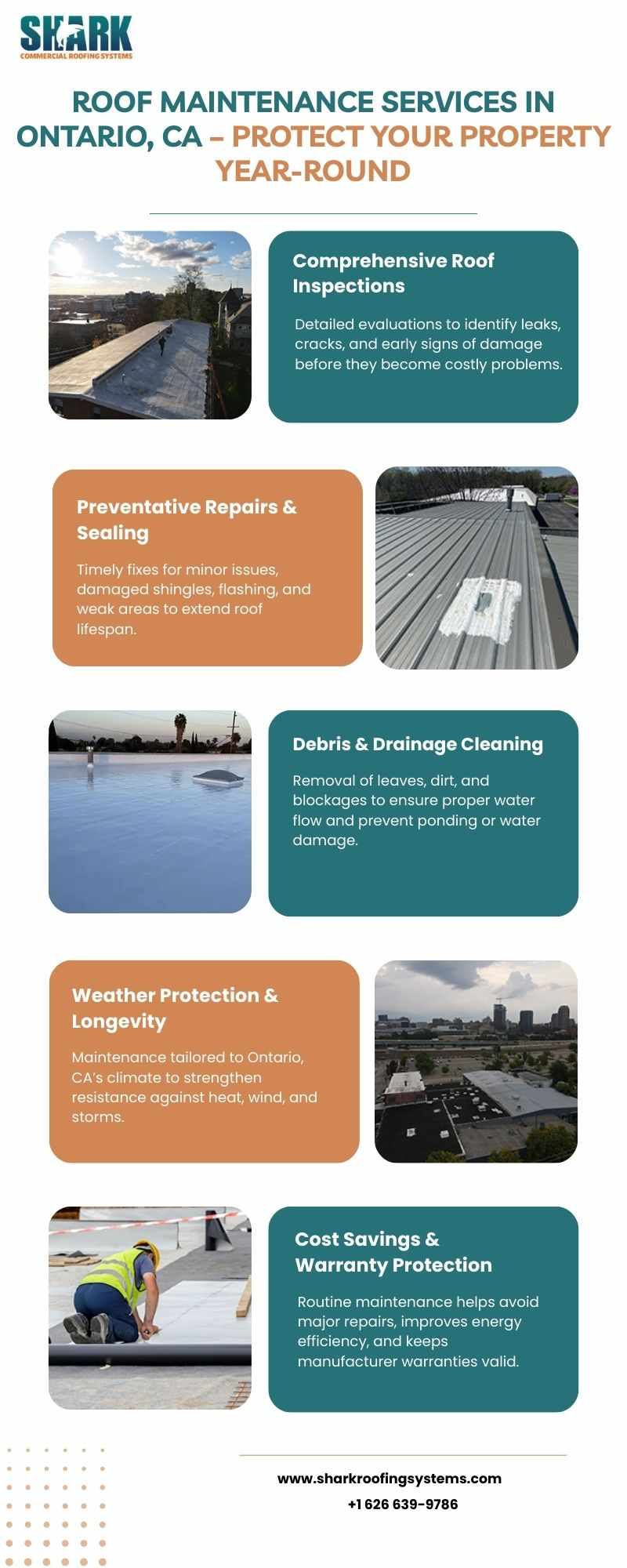 Protect your business property with expert commercial roofing services in Ontario CA from Shark Roofing Systems. Ignoring roof maintenance can lead to costly repairs and structural damage. Our team provides timely inspections, repairs, and coating solutions to extend your roof’s life and safeguard your investment.